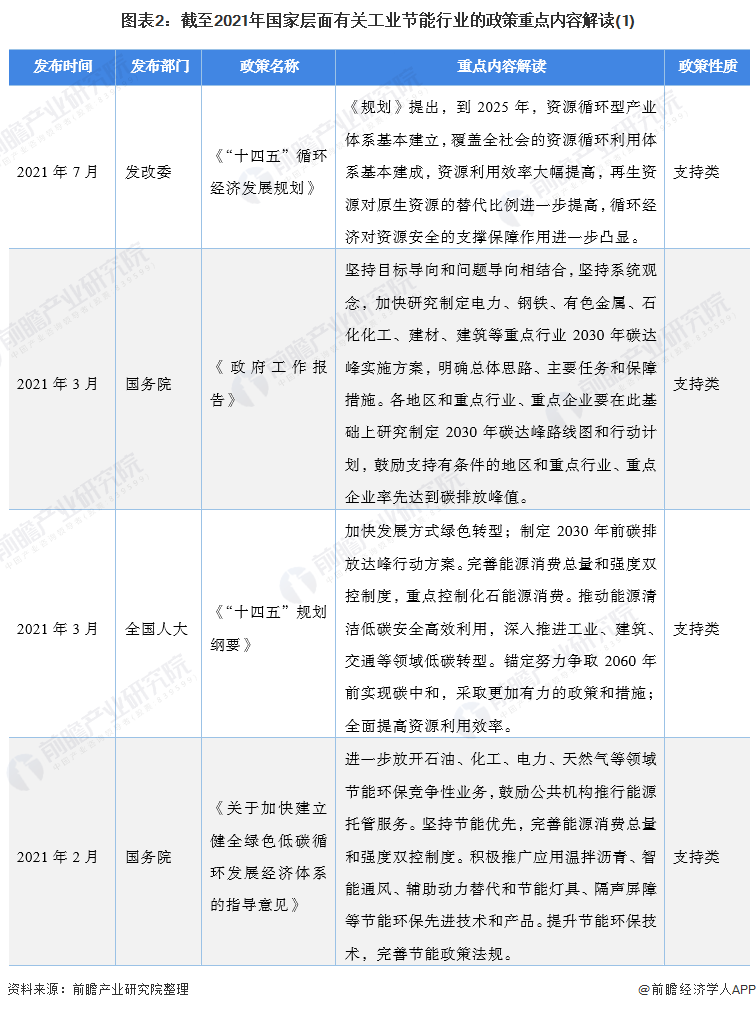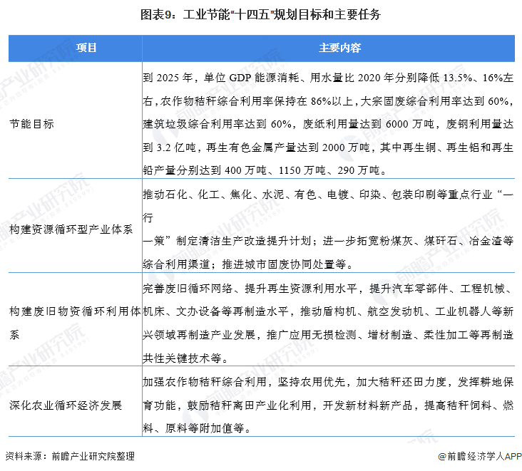 2021年7月1日,國(guó)家發(fā)改委發(fā)布《“十四五”循環(huán)經(jīng)濟(jì)發(fā)展規(guī)劃》,明確提出了到2025年的節(jié)能目標(biāo)和工業(yè)節(jié)能重點(diǎn)任務(wù)。為達(dá)成節(jié)能目標(biāo),《“十四五”循環(huán)經(jīng)濟(jì)發(fā)展規(guī)劃》主要從資源循環(huán)、廢舊處理等角度出發(fā),提出制定工業(yè)行業(yè)的清潔改造計(jì)劃,提升固廢、金屬的再利用水平,開(kāi)發(fā)農(nóng)業(yè)新產(chǎn)品、新材料等。