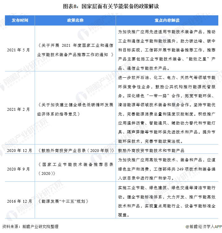節(jié)能裝備是工業(yè)領(lǐng)域節(jié)能改造的一大利器,工信部不定期發(fā)布節(jié)能技術(shù)裝備,鼓勵(lì)工業(yè)企業(yè)推廣使用。2021年國(guó)家在《關(guān)于加快建立健全綠色低碳循環(huán)發(fā)展經(jīng)濟(jì)體系的指導(dǎo)意見(jiàn)》等政策中明確提出積極推廣應(yīng)用溫拌瀝青、智能通風(fēng)、輔助動(dòng)力替代和節(jié)能燈具、隔聲屏障等節(jié)能環(huán)保先進(jìn)技術(shù)和產(chǎn)品。近年來(lái),節(jié)能準(zhǔn)備相關(guān)政策如下: