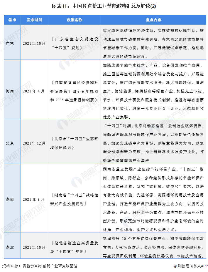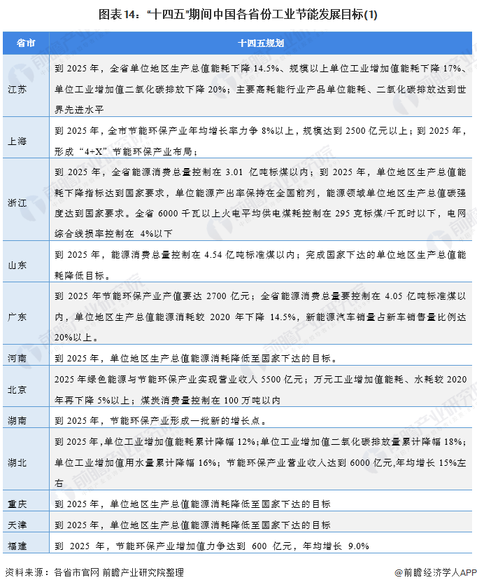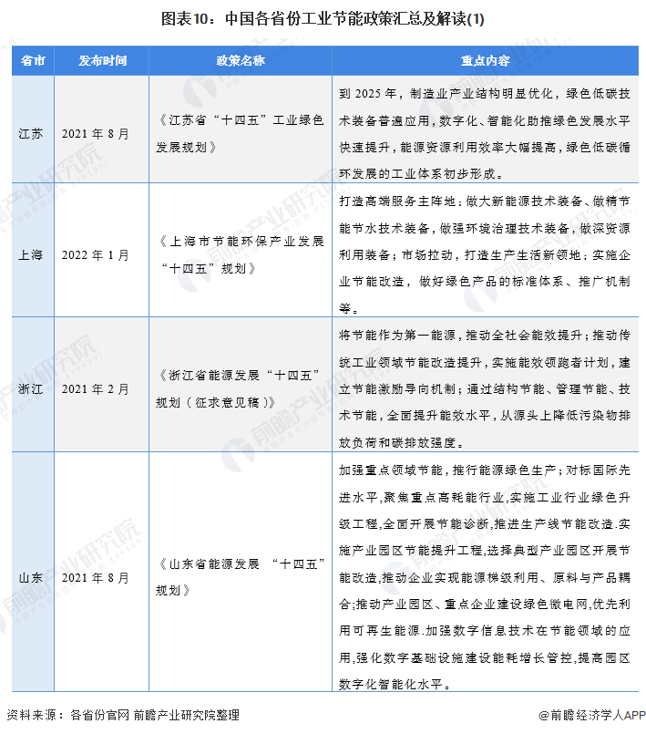 目前,多個(gè)省市包括江蘇、浙江、山東、廣東、上海、北京等,在“十四五”時(shí)期發(fā)布了推動(dòng)工業(yè)領(lǐng)域節(jié)能的支持性政策,明確了節(jié)能發(fā)展的目標(biāo)及工業(yè)節(jié)能領(lǐng)域的發(fā)展規(guī)劃等,主要內(nèi)容如下: