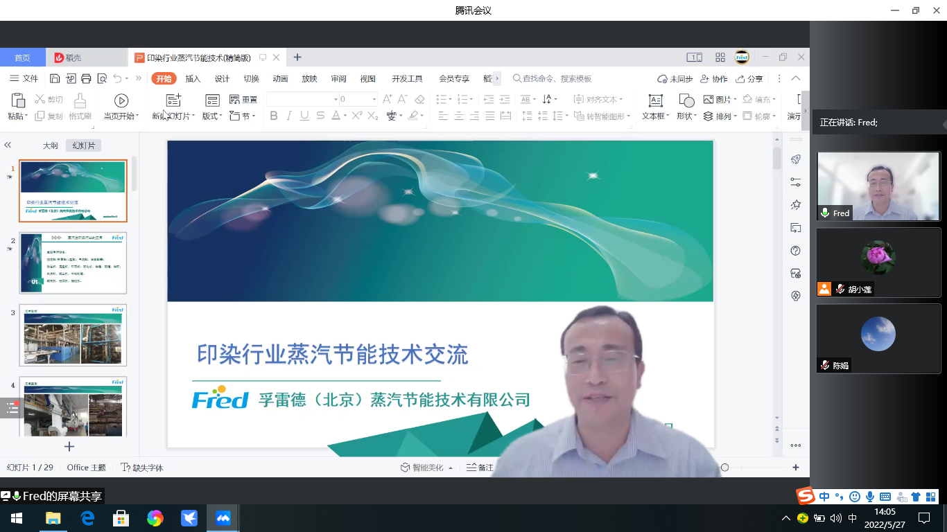2022年5月27日孚雷德(北京)蒸汽節(jié)能技術(shù)有限公司在Clean by Design(CbD)國(guó)際綠色供應(yīng)鏈創(chuàng)新項(xiàng)目組織的紡織行業(yè)應(yīng)對(duì)氣候變化專才系列技術(shù)培訓(xùn)課程中為幾十家印染企業(yè)提供了主題為“印染行業(yè)蒸汽系統(tǒng)節(jié)能減排”的線上技術(shù)培訓(xùn)。